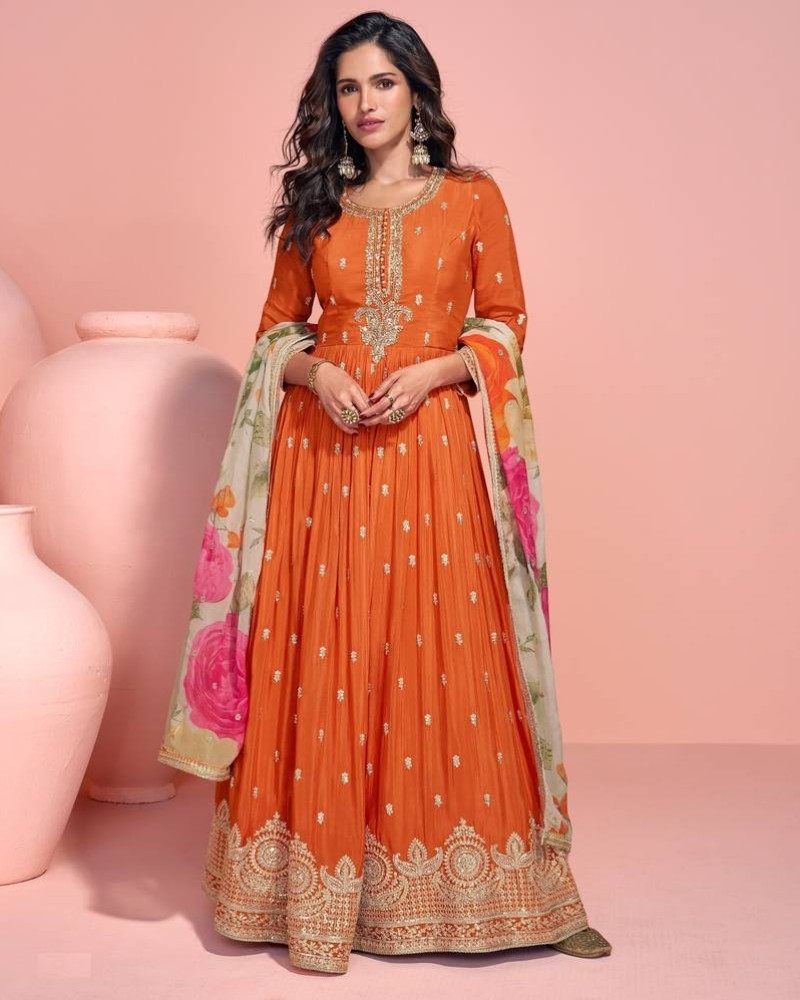 Anarkali Suit Is Prettified With Embroidery Work,Zari And Sequence Work As Shown Which Makes It Appear Classy. This Top Is Made Of Chinon Fabric Which Is Accompanied With Santoon Inner And Chinon Dupatta. Women Can Buy This Suit To Wear For Their Parties And Functions.Bottom Not Available With This Suit.
